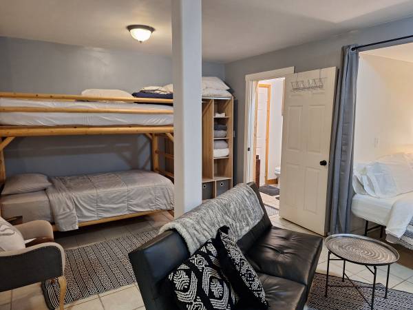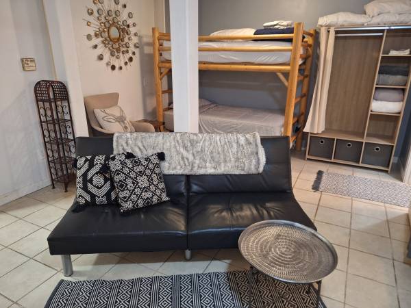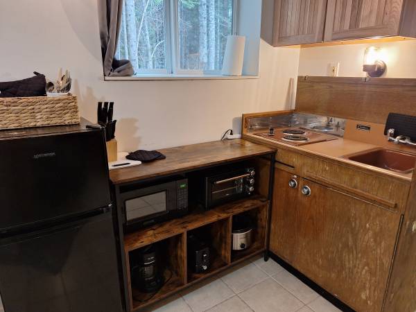 Kitchenette has microwave, air fryer, mini fridge, cooktop, sink, coffee maker, toaster and some pots and pans