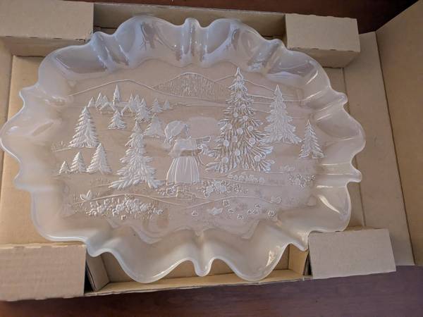 Mikasa~ 17” Oval Platter - Holiday Classic Serving Plate. This beautiful, unique, large Cristal Platter was made in Germany of clear quality etched glass with unique frosted scalloped, ribbon shaped edges. Excellent details, in like new condition, stored in original protective box. It is hard to take pictures of glass without the background showing. The the first picture is taken on a wood table, the second picture is taken on a green tablecloth. Really must see to appreciate the beauty.