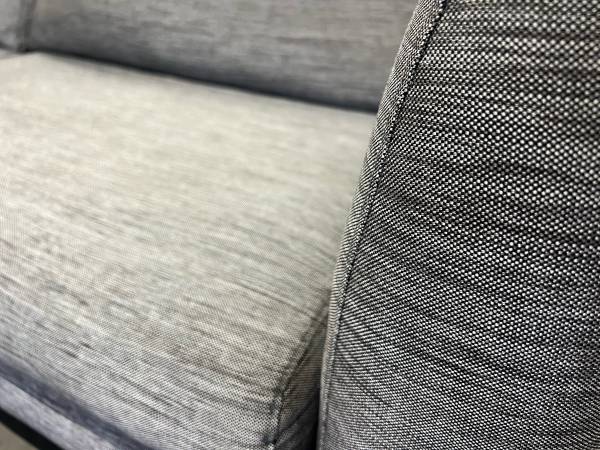Like new condition! 90”Wx37”Dx26”H. The fabric, in sort of a metallic fashion, reflects light differently at different angles. This quality and its base color of grey add to the industrial modern...