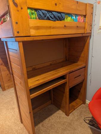 Solid wood. Sturdy. Extra thick bed slats. Lots of storage. Desk, shelves and drawers, all working. Very clean. 43" width 62.5" height (base to top of railing) 81.5" length Easy assembly Mattress...