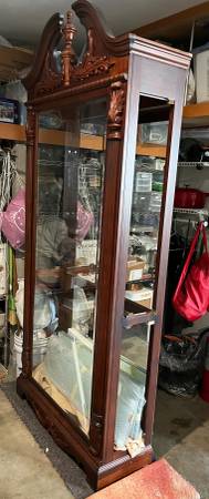 It is also pictured in my garage, so please look past the items around it and reflected in the mirror. It has a light at the top that needs some work, but all the fixtures are there. This is a beautiful cabinet worth MUCH more than I am asking for it.