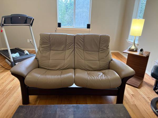 Selling a Stressless Buckingham High Back 2-seater loveseat in Paloma Mushroom leather with Espresso wood. Barely used and in excellent condition—clean, no rips/tears, no stains.