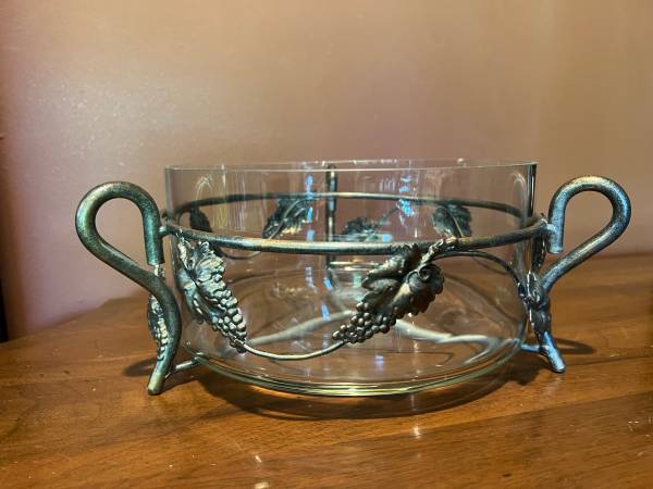 This is a beautiful mid-century modern glass bowl/planter in a metal frame base with grape vine leaves on it.