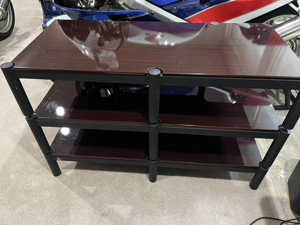 Lovan medal frame modular stereo rack. Spiked feet to reduce vibration feedback 1/2" thick wood shelves Slight scuff mark on one of the shelves Very sturdy design W = 43.5 D = 21.5 H = 26.75
