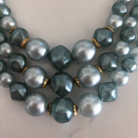 Beautiful vintage 3 strand beaded necklace and clip on earrings Faux pearl beads are of varying sizes and shapes Beads are 2 different colors of blue Gold tone spacers on each strand Shortest strand...