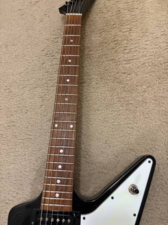 The Gibson Explorer in ebony! If you’ve never played or owned one of these you’re missing out. Metal, rock, classic rock and even blues are all easy sounds to get from this guitar. Gibson Hardshell case black exterior and plush white interior. I have most of the case candy.