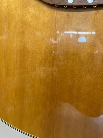 Has a surface/finish crack from the bridge to the bottom of the guitar, cosmetic only.