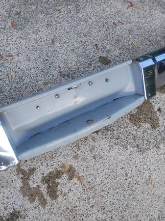 Decent shape, decent chrome, gray steel bumper with chrome ends. 75 3/4" tip to tip, 40 1/4" between inner bolts. 52 1/4 between outer bolts. Inner bolts 2 1/4" apart, outer bolts 3 3/8" apart....