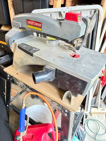 16" Craftsman Scroll Saw Variable Speed on a stand Probably 1/2hr use over the years. Works great! Additional Pics available upon request Going to Goodwill next week if not sold.