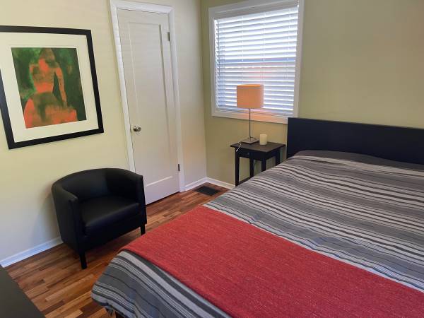 This is a comfortable, fully *furnished* and equipped and decorated free standing estimated 1,007+ square foot house with one car garage. Oak hardwood floors, 2 Bedrooms, large living room with comfy sleeper sofa, full bathroom with bathtub and shower, plus large backyard deck with Weber grill. Three closets.