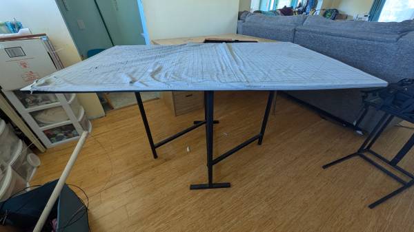 Collapsible cutting table opens up to approx 40"x60" and folds down relatively small. Needs new batting and ironing cover, is not very sturdy but if you need a big flat surface for light work, it'll do the job.