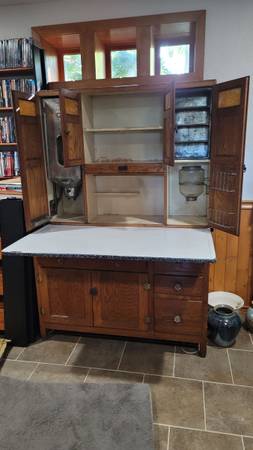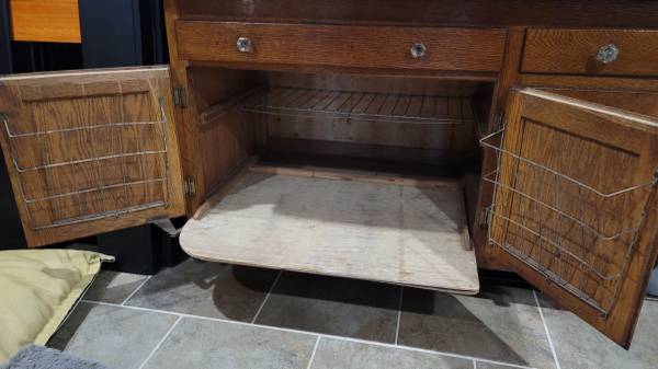 Sellers brand antique baking cabinet, complete with flour, sugar containers and other hardware. Enameled slide-out counter top. Lower cabinet slide out shelf. Great condition.
