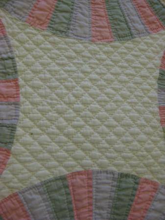 90 year old hand made and quilted double wedding ring quilt amazing hand quilting! Tiny even stitches scalloped edges, bubblegum pink backing 60" x 87" excellent condition, no worn through areas...