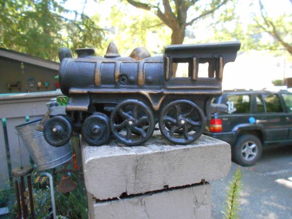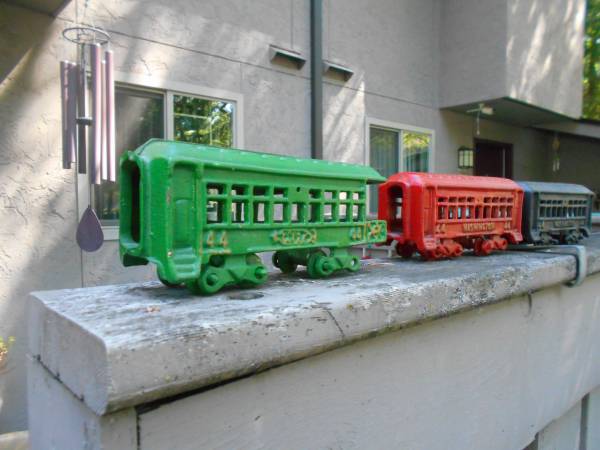 This is a vintage 5-piece train set made of cast iron, manufactured in an unknown country or region in 1950`s. The set is modeled after the PRR train and includes a locomotive, tender, and three cars. It is a collectible item for vintage and antique toy enthusiasts.