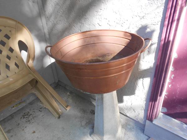Round copper metal tub from Nordstroms made in India in the 1960s 26 in at handles x 21 1/4 in across x 15 in deep x 9 1/4 in heght