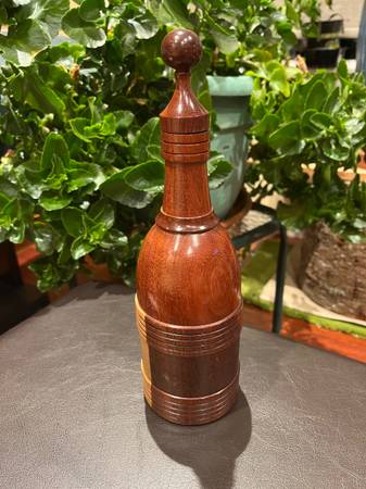 Handmade wooden bottle . This bottle is a very decorative center piece on any coffee tale. It is 3 1/2 inches in diameter and 11 inches tall. Would make a special gift for Christmas.