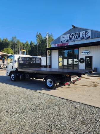 2013 ISUZU NPR HOOK LIFT/ROLL OFF TRUCK WITH UNDER 100K MILES. FLATBED IS 15' x 8'