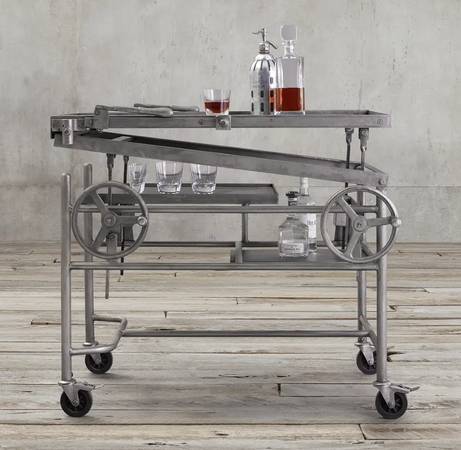 Crafted from iron with a tempered glass top, the French crank-lift bar cart has a Z-lift mechanism that makes the shelves adjustable and four swivel wheels that can be locked for stability. 2 lower, metal shelves offer additional space for storage and display. Fitted with swiveling casters that lock.