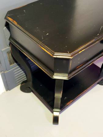 26 inches high, 26 inches wide, 20 inches deep. It has a distressed finish, satin black in color, with professional grade tinting wax protecting the piece.