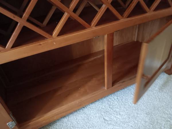 Has a top shelf, full length mirror, 2 drawers, holds 10 wine glasses and 11 bottles with storage underneath. Perfect condition.