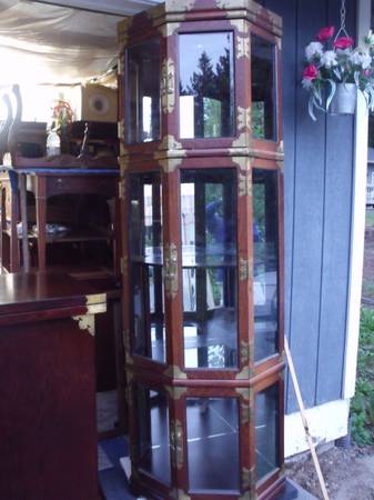 Seperate 'Display Case' construction = matching Elm Wood with beautiful matching etched oriental brass hardware, also featuring 4 display levels and a light at the top of the Display Case shining down through 3 levels to the bottom 4th display area.