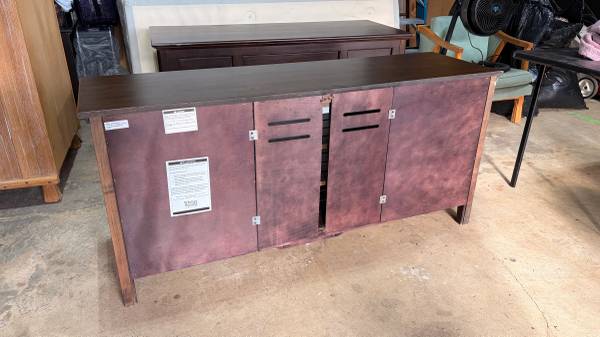 • Display Center: Includes a central glass-door cabinet with three adjustable, slatted shelves—perfect for media components or decor.