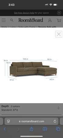 Hey, I'm selling my Room & Board Steven's Sofa. It's 106" with a reversible chaise and in awesome shape, only gently used for nine months in a super clean, pet-free, smoke-free place.