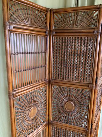 Beautiful Vintage Boho 3 Panel Sunburst Geometric Rattan Room Divider. Please see pictures for examples of wear at top of panels and one small broken piece in center. It is fully expanded in photos...