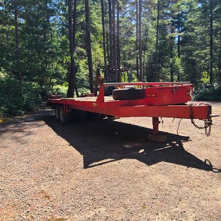 30 feet, 5ft tongue, 20ft deck, 4'6"beavertail, 5ft ramps. Barker shop built, had mobile home axles. Replaced axles with 6000lb Hayes bogey axles (4) in 1994, electric brakes, 8 lug 16" wheels, has Toyo 225-75-16 10 ply (8) 2 spares.