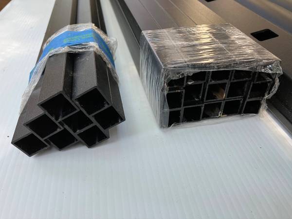 Available here are some Weatherables brand Stanford model textured black aluminum handrails in excellent condition. I'm a contractor and these were left over from a recent remodel project. They originally came in a kit. There are seven 6 foot long top rail 'bread loaf' shaped top rails, one 2 foot top rail, one 3 foot bottom rail, and twenty-three 3 foot long balusters.