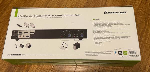 Item in original box. IOGEAR 2-Port 4K Dual View DisplayPort KVMP Switch with USB 3.0 Hub and Audio. Items all box that came in the original.