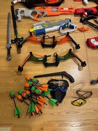 My son has decided to part with the Nerf Guns & Bows Includes ammo, face shield, safety glasses, extra magazines See pics for full lot of 7 pistols, shotgun, 6 shoulder weapons, 2 swords, 3 bows...