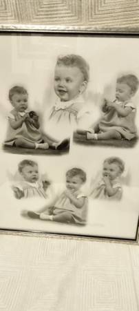 ANTIQUE 1951' BABY PORTRAIT by: Erna Bert Nelson (*PROFESSIONAL PHOTOGRAPHER). Erna Bert Nelson, is practiced her professional photography career in Spokane,Washington from 1941 to 1959. This portrait photograph has six still portraits of a baby from the 1951' year era. A great 11"x14" piece of art photography. A great piece of art to display in your babies room, or pediatric office wall waiting room. Has a very nice antique 11"x14" metal frame that encompasses the portrait. $50. Email me.