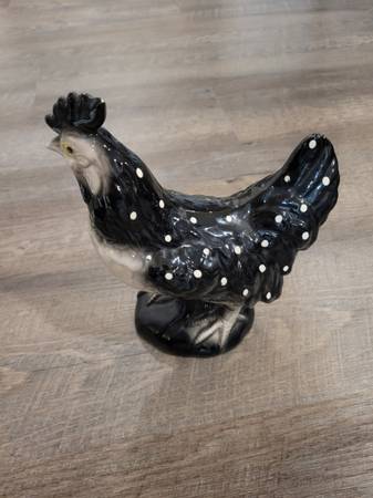 Black and white polka-dot ceramic rooster figurines and black with 3 white durable enamelware farm animal round plates.