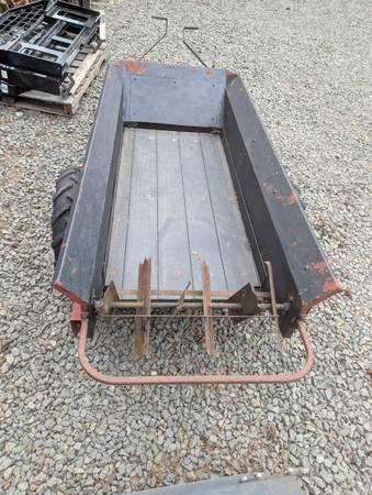 Mill Creek model 25 ground driven manure spreader. Has rust and needs some work. Live floor is gone, was replaced with just wood. Sprockets are still there. All the mechanism for the rear spreader are there but need freed up. Tires are decent.