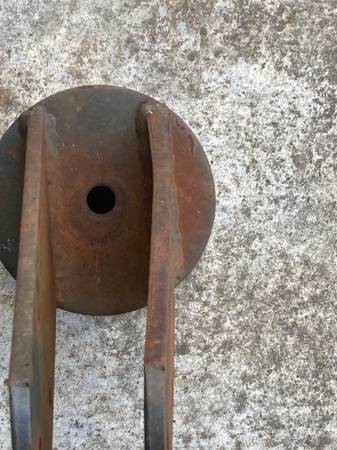 Pole Mount / Mounting Bracket - Extremely Heavy Duty. Originally designed to fit over a 6” diameter wood or metal pole, round base has an interior diameter of 6" and 6" tall sides. Arms are 3/8" thick and approximately 12" long at longest point and 9" to holes. Held huge satellite dish. Not new but has possibilities...