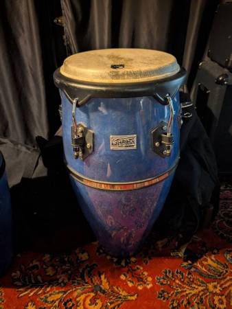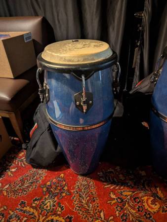 A pair of great condition congas with a stand, I believe they are 10" and 11". Comes with A pair of used, but good condition rolling Gator Cases.