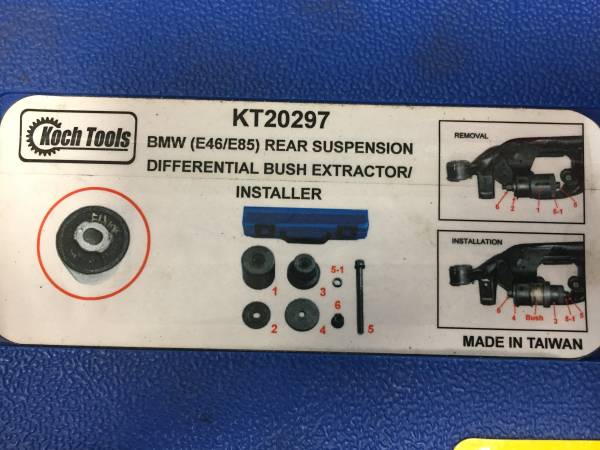*[This tool set allows for on-car installation AND removal of the three rear bushings located on the semi-trailing arm of E46 BMW 3-series cars: