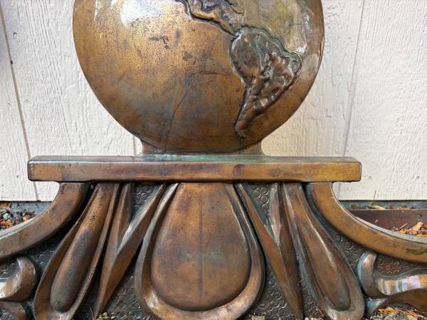 15’ long 41” high, 5 sections American eagle on the globe. This piece is hundreds of lbs. flat on back with bronze angle mounting bracket. This bronze plaque is 2” thick in some areas. This would be awesome over a ranch entry, mount on building. Piece is very old, has always been outside, original patina.