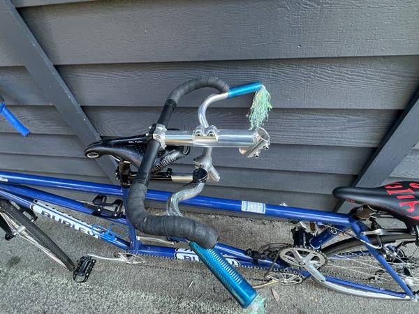 Late 1990s (USA made) Burley Rumba Tandem bike. Includes a kid stoker kit that would allow you to ride with a younger child if desired. Pilot fits a 57 cm but could be modified up or down as this is a very flexible bike (current rider 5'11"). The stoker is set up for an elementary sized kid with a flat bar but we will include a drop bar as well so you can use either. The kid kit for the stoker lets you set this up for a child but is easy to remove if you wish to ride with another adult. Bike is in great mechanical condition with newer tires and well-maintained chain. This is a solid steel bike and really built to last. Is setup with flats on the front and cages on the back for test rides but happy include SPD cleats if you'd like.
