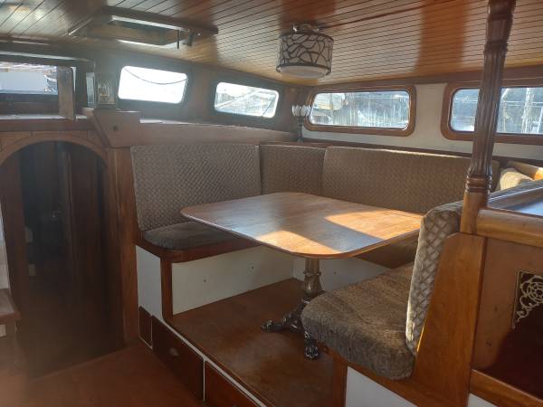 We upgraded the dinette table to be full size for a family, underneath and behind the cushions is great food storage, huge pull out drawers, it has a 110 freezer but we always used it for a food pantry. We installed a chest freezer that our solar runs great. There is a nice size fridge in the galley, and a propane stove/oven that works great. Wine glass cabinets and wine glass holder. She has a lot of deck room. The aft deck is quite large as well, where the full solar array and a stainless steel rail mounted BBQ. The top of the pilot house has an emergency life raft. All emergency equipment on board, flares, fire extinguishers, CO alarms, fire alarms, propane alarms, high water alarms. Has two depth sounders and an old james bond era radar. New zincs.