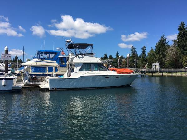 The Tiara 3600 Convertible is a well-built flybridge sedan whose blend of interior comforts and open-water performance made her a popular boat with cruisers and anglers alike. She’s built on the same hull used for the 3600 Open, a proven offshore design with cored hullsides and a relatively wide beam—a stable fishing platform. Fit and finish is excellent—typical of the quality you get in any Tiara product. The single-stateroom layout with a mid-level galley and dinette forward of the lower helm station, a queen sized berth forward and a separate stall shower in the head. The cockpit includes a transom door, three deck lockers and a stainless ladder to the flybridge. 350hp Crusader 454 CI inboard gas engines cruise the 3600 at 13 knots, WOT 19–20 knots. It’s a sturdy, well-engineered boat that has served our family well for 10 years.