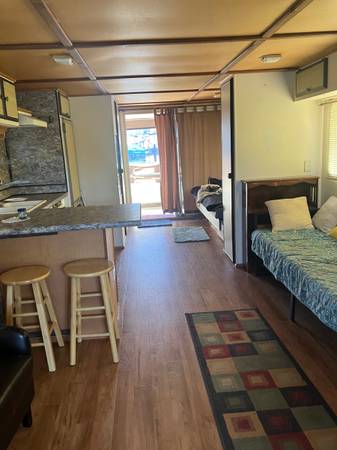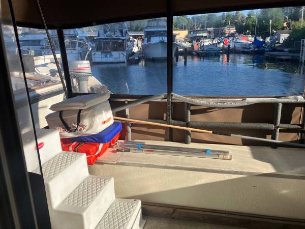 40’ aluminum pontoon patio cruiser(1986) boat, 2 bedrooms 1 bathroom, with most efficient equipment on it. Fully furnished. Enclosed stern and bow. Johnson motor running very well. 50 amp shore power. Buyer will need to move the boat out of marina unless will buy it with the 50 foot slip.