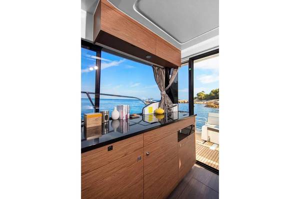 Aft sliding side door at helm plus large sun-skylights to flood the interior with natural light.