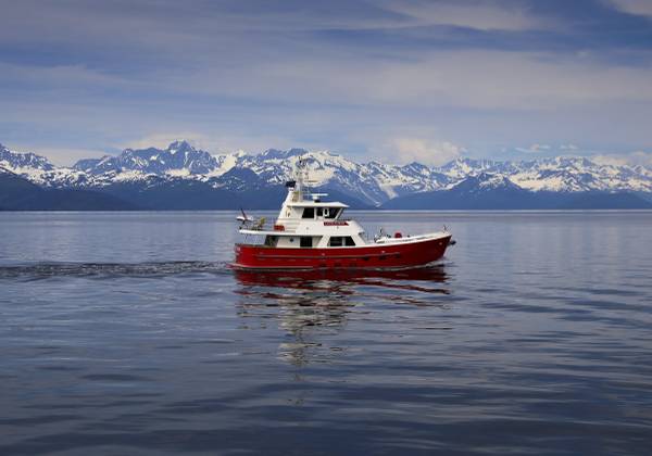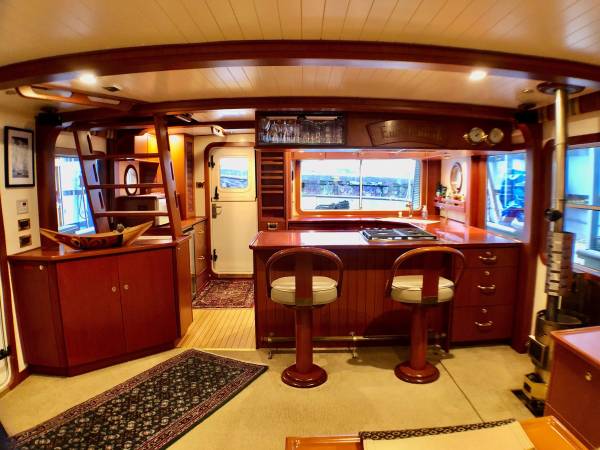 The saloon and galley complement each other by offering an eat-in breakfast bar with built-in barstools. Every consideration has been given to the best use of space by designing storage features throughout, including built-in bookcases, magazine racks, and additional pantry storage. A custom designed hydraulic lift table in the saloon is utilized during the day as a coffee table, but unfolds to a banquet sized table which will accommodate up to ten for dinner. A Dickinson Antarctic diesel furnace offers warmth on even the coldest Alaskan evenings. A starboard side weathertight door allows access to the side deck and bow.