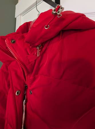 This is a great heavy winter down coat. Brand new. I ordered online. I was delighted with quality but size is WAY OFF despite using the very specific size chart on line. I need a 12 short, and I would guess this is a size 6 tall, so great for tall, thin woman or girl. Color is nice vibrant red, fabric is substantial, easy zip and snaps in front, hood is detachable. Exactly what I wanted but just doesn't fit! Return unfortunately was not available. Made in China, shipped from California.