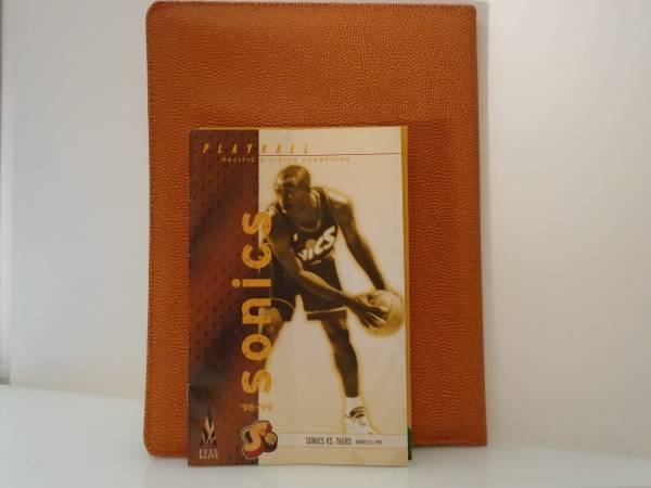 Seattle Sonics unused Basketball Leather Notebook * Playbill 98-99 season Sonics VS. 76ers March 2 1999 * Playbill 2001-2002 season Sonics VS Pistons Dec. 22 2001* Seattle Supersonics Taco Time...