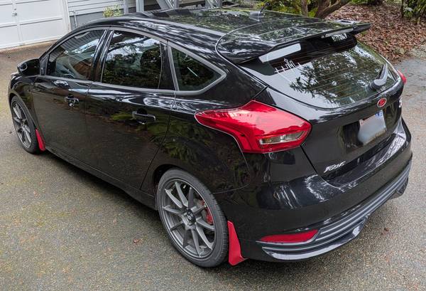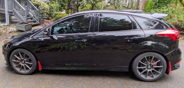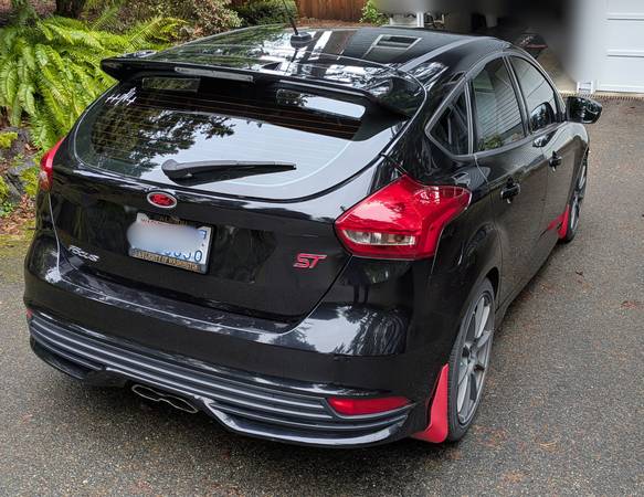 Offering a meticulously maintained, Shadow Black 2017 Ford Focus ST. This is a two-owner vehicle, held entirely within the same immediate family. Notably, this car has no performance or powertrain modifications—the engine and tuning remain 100% factory stock. All upgrades are strictly cosmetic or interior-focused.