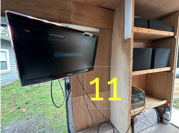 11) Installed 360 degree TV bracket with Samsung Syncmaster 27” Flat screen television/monitor. Bracket rotates and extends outside of the van for outdoor viewing. Also custom shelf installed next to TV that can fit a ton of stuff.