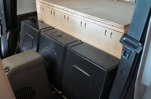 The cargo box folds out to accommodate interior sleeping, holds 50L of water, holds 2x NATO 20L fuel canisters, an ICECO fridge, and two large kitchen drawers with a pop-out cutting board lid. It also has a section dedicated for mounting a standalone power station and can carry many dufflebags of additional cargo.